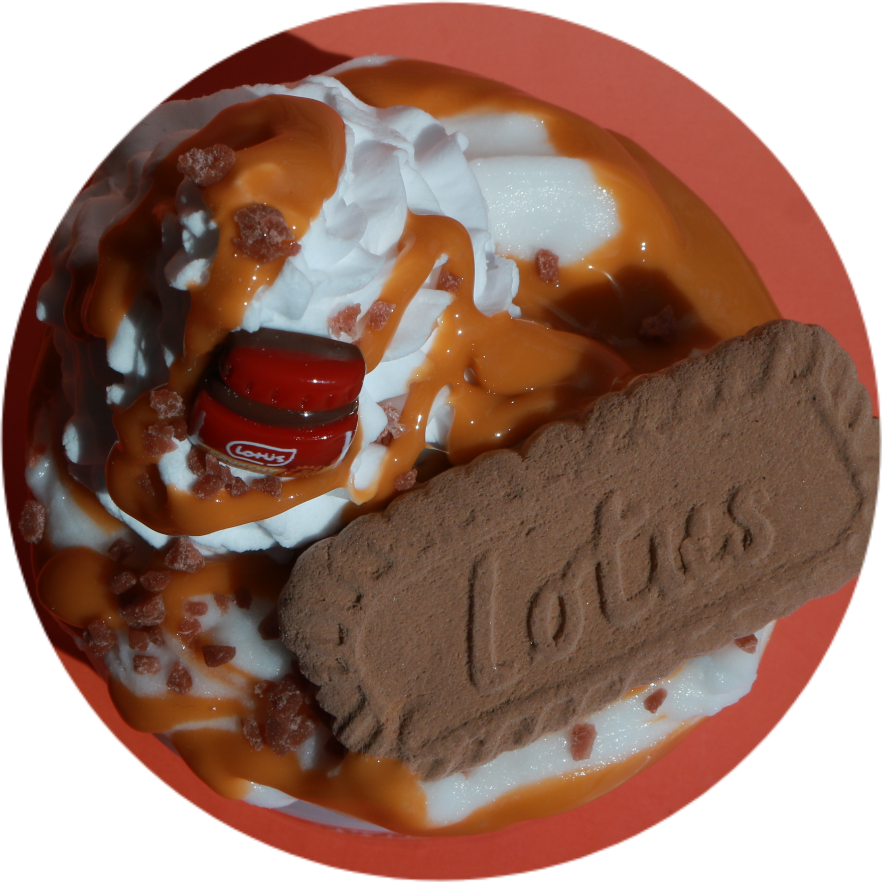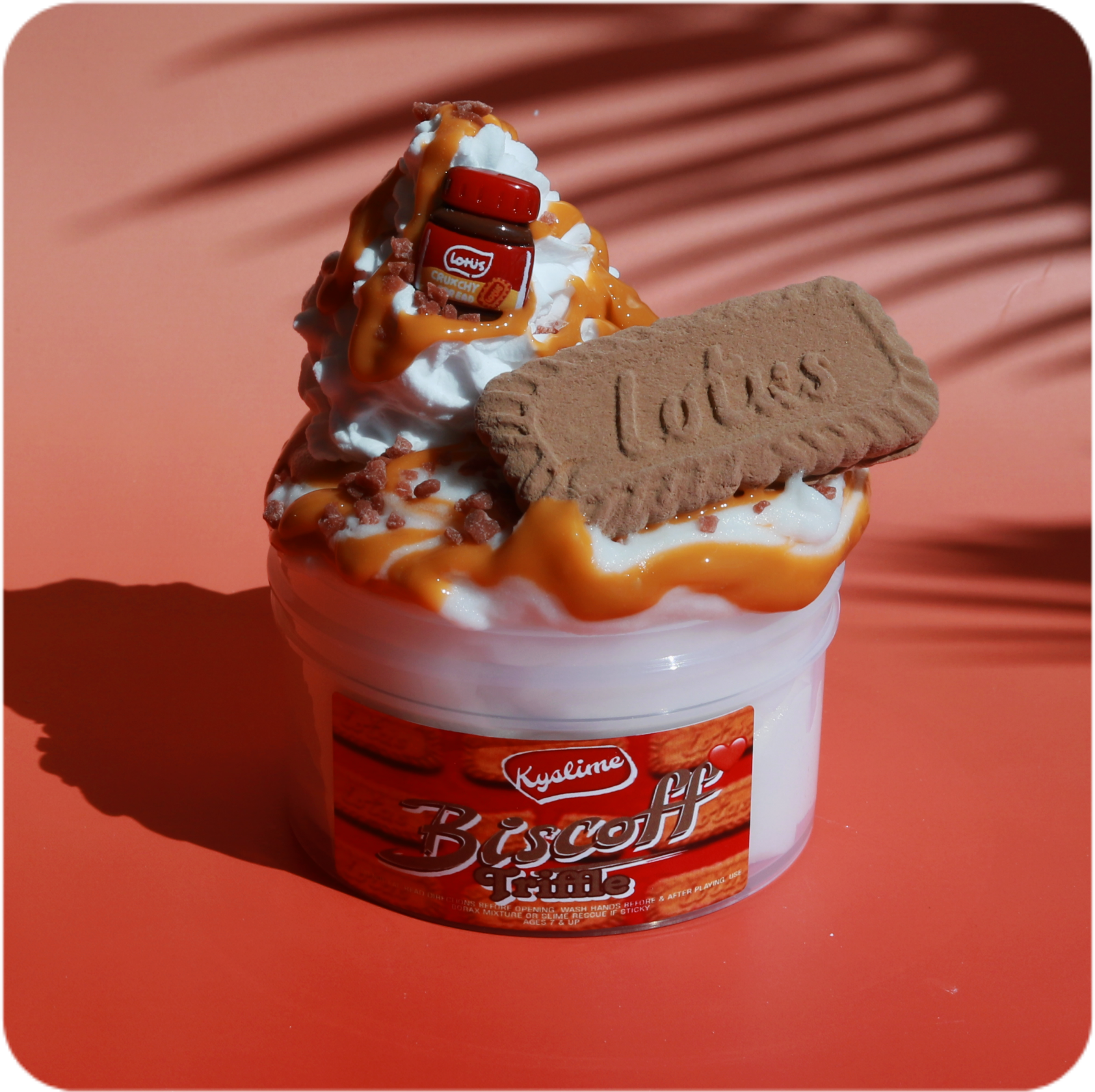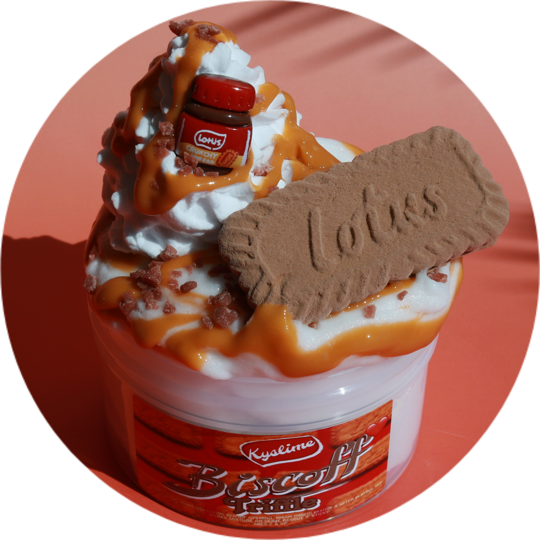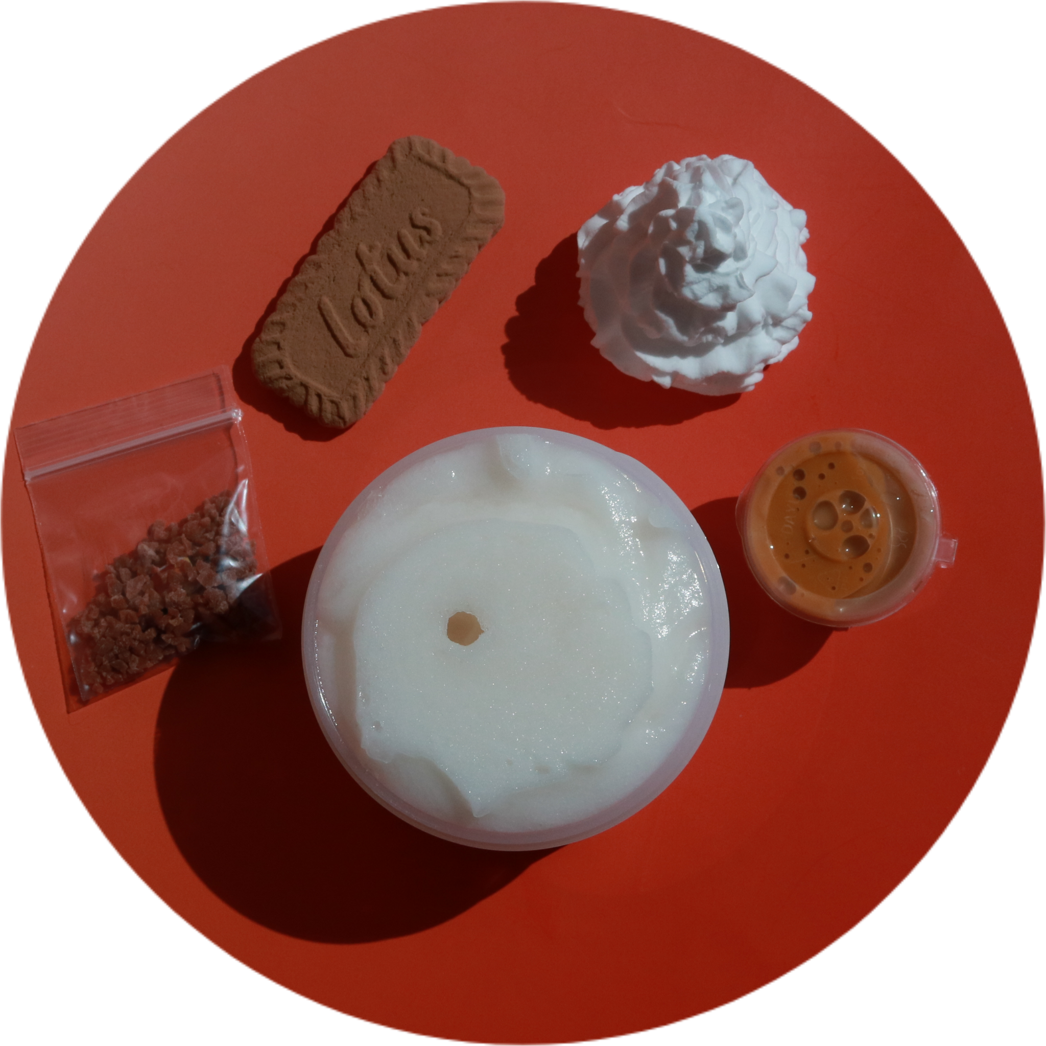 DIY: cookie butter charm, 1 Lotus clay cookie, clay whipped cream, choco sprinkles, 1oz caramel slime drizzle,