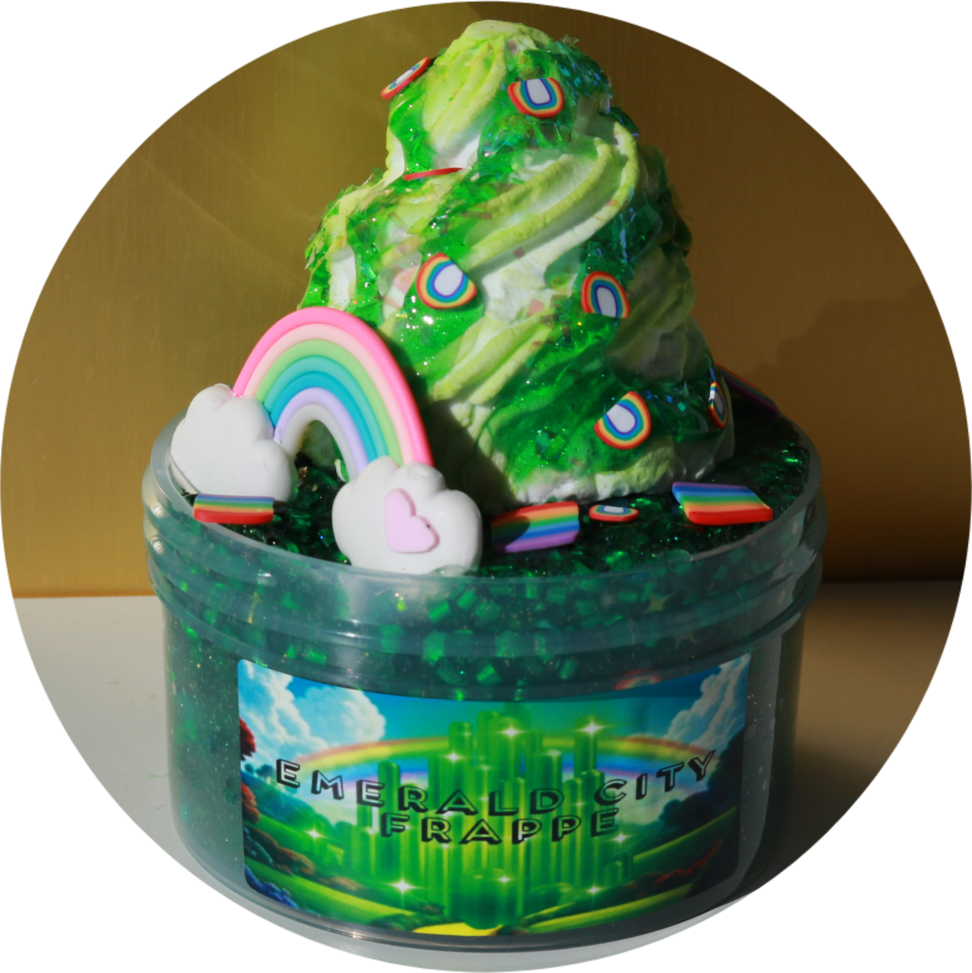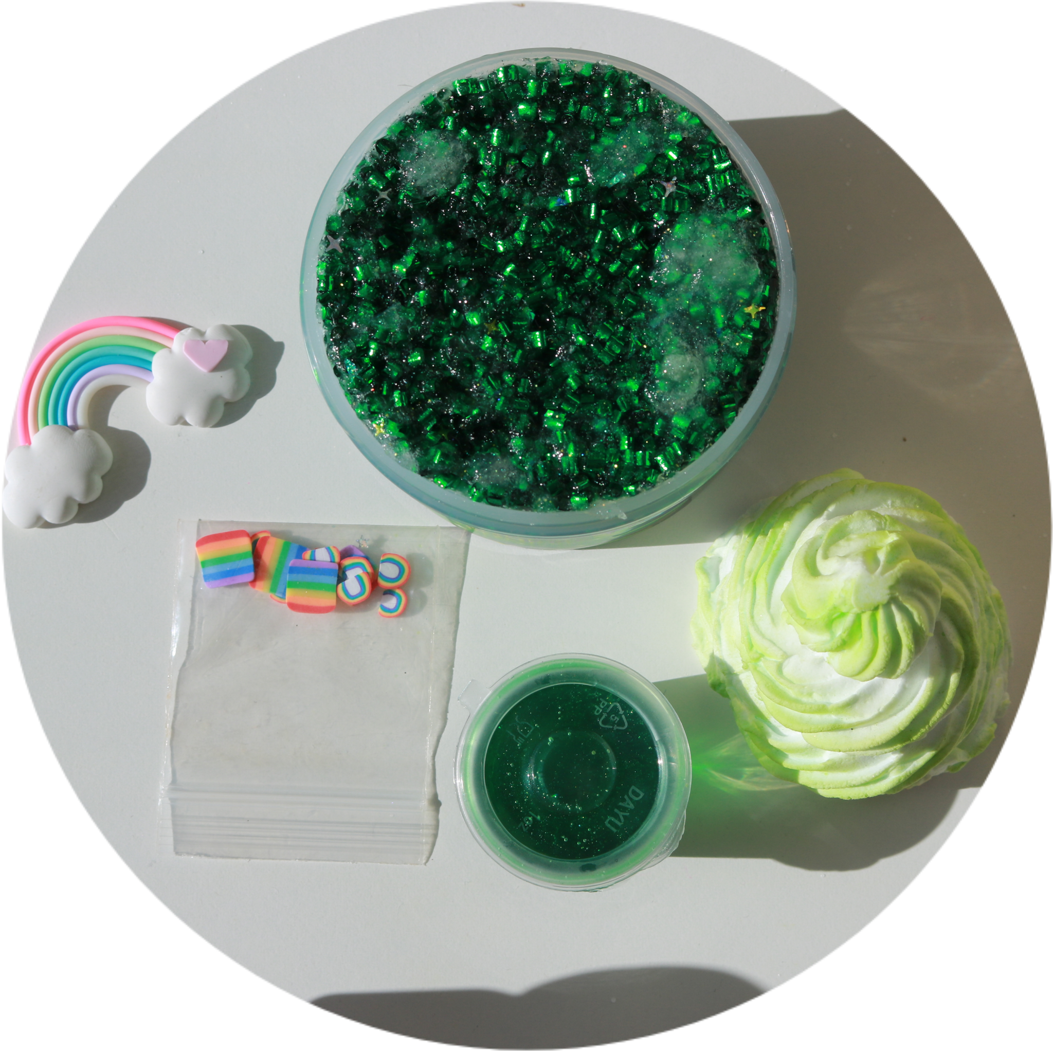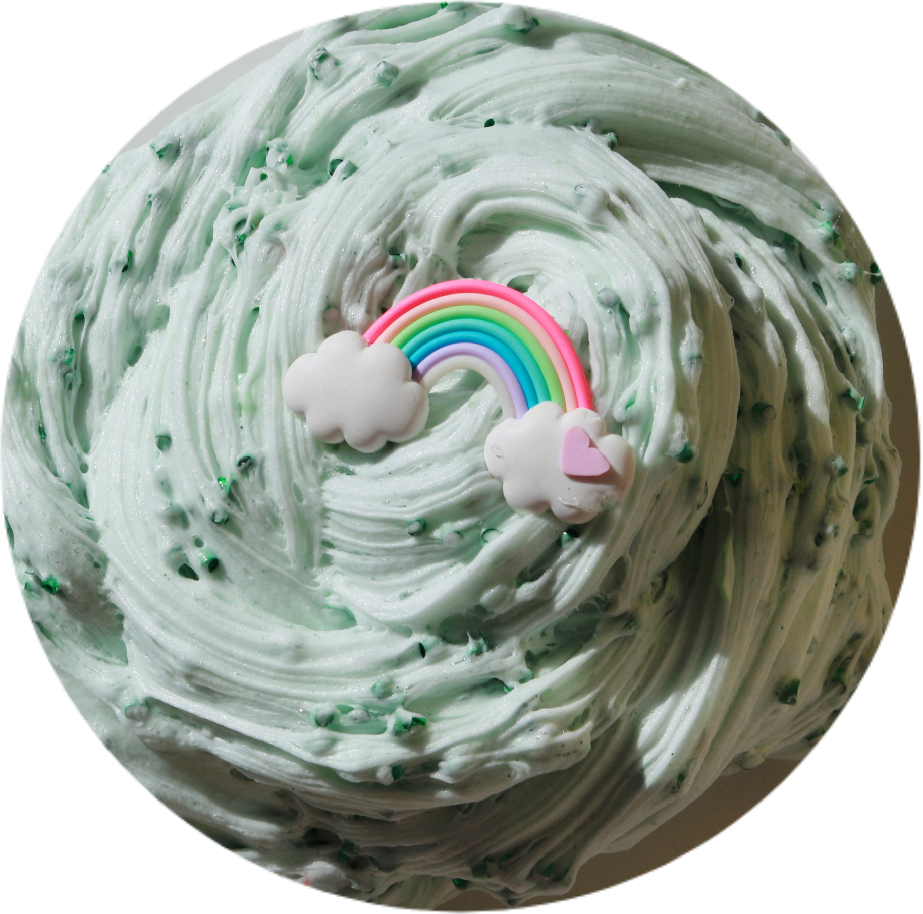 DIY: clay whipped cream, 1oz green drizzle slime, random rainbow clay charm, rainbow sprinkles