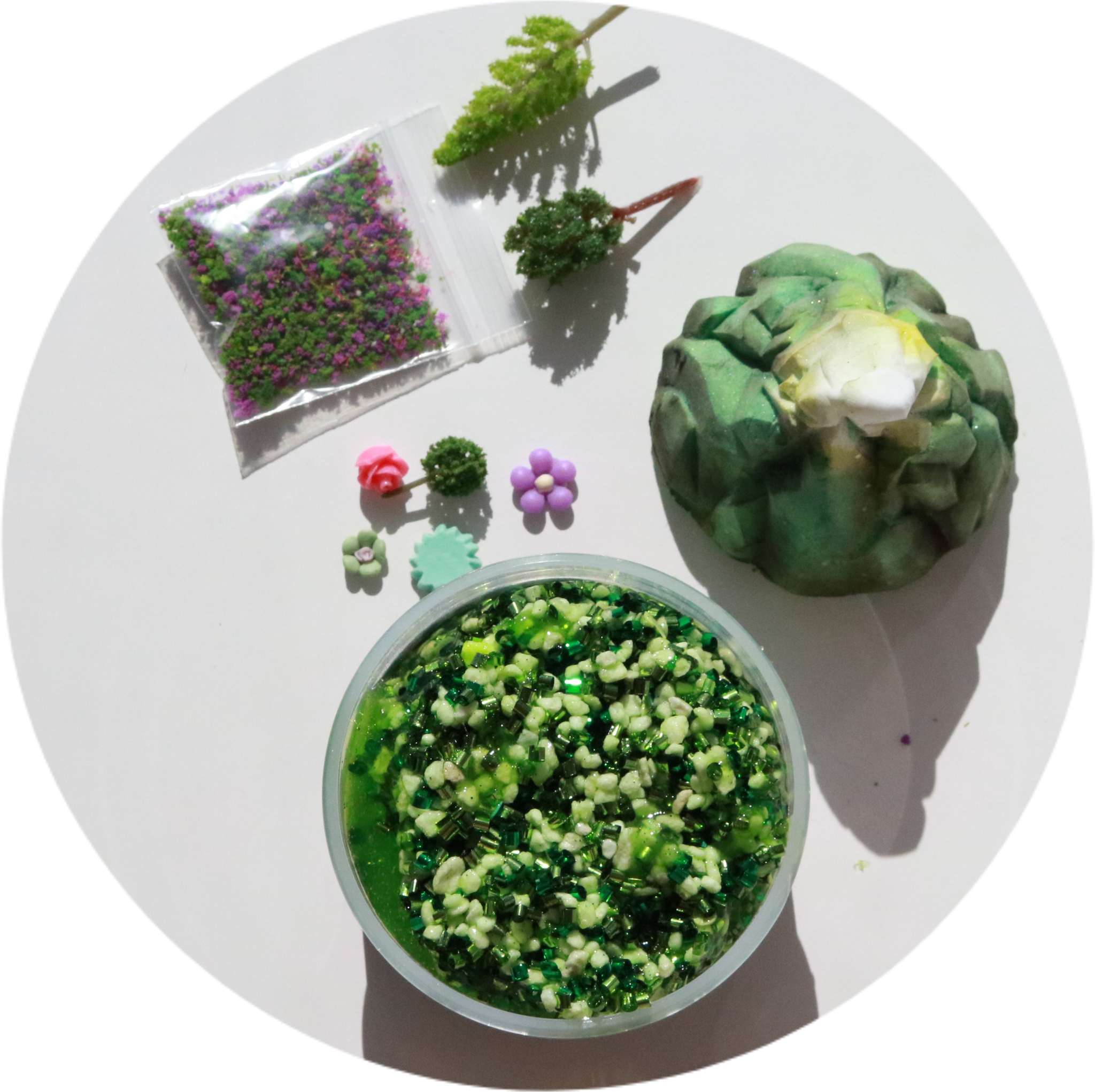 DIY: clay mountain, mini trees, fake moss powder, random flower charms