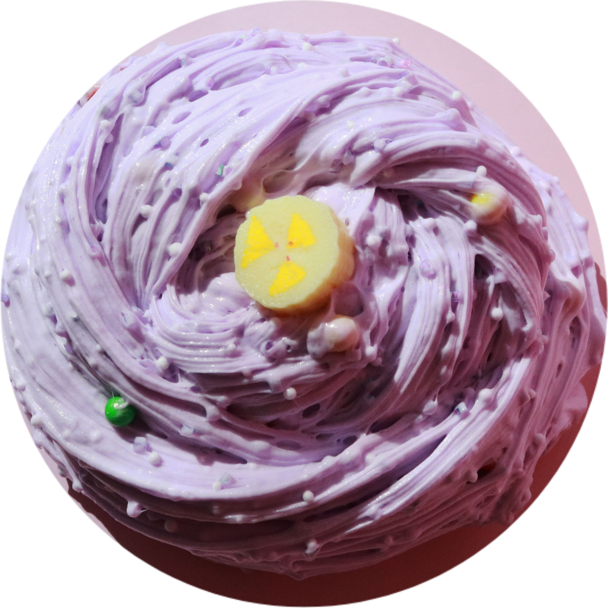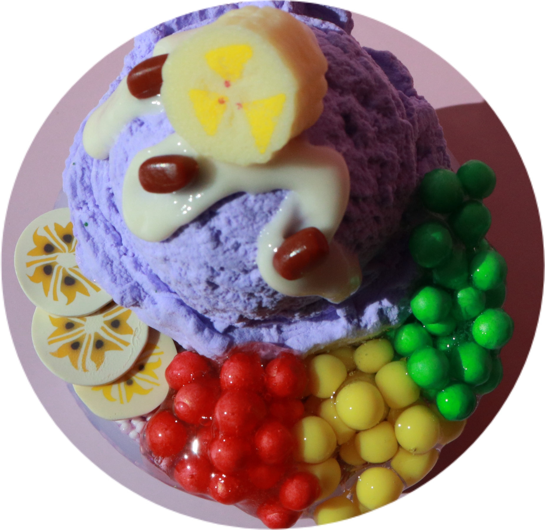 DIY: clay ube ice cream scoop, banana slices, 1oz condensed milk slime, 3oz jelly fruit slimes, faux azuki beans.